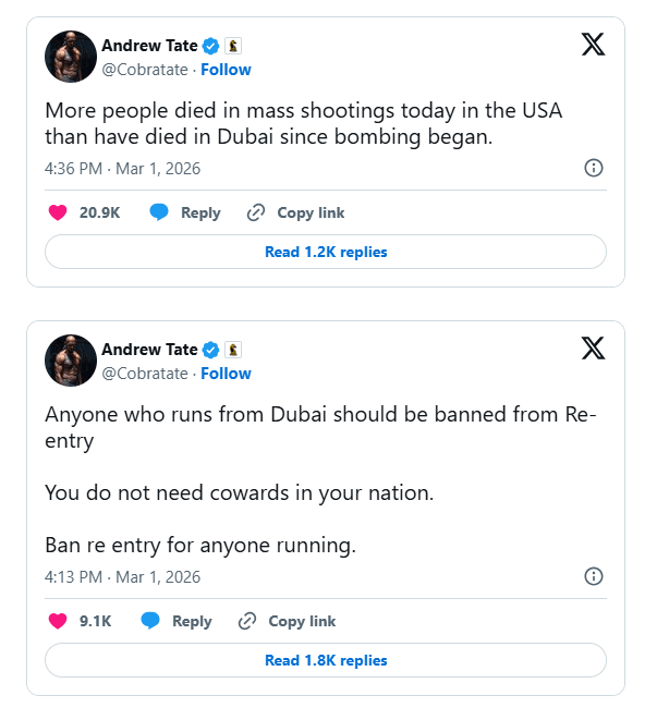 Ο Άντριου Τέιτ, ο οποίος βρίσκεται στο Ντουμπάι εν μέσω των δικαστικών του περιπετειών, επέλεξε μια πιο επιθετική στάση στα μέσα κοινωνικής δικτύωσης.