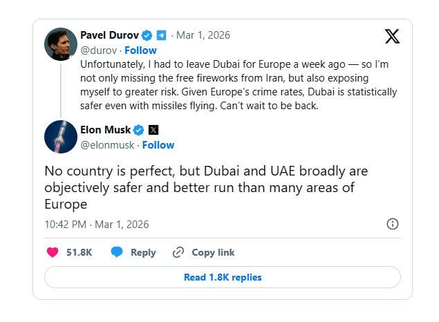 Στο ίδιο μήκος κύματος κινήθηκε και ο Έλον Μασκ, ο οποίος απαντώντας στον Ντoύροφ σημείωσε: «Καμία χώρα δεν είναι τέλεια, αλλά το Ντουμπάι και τα Ηνωμένα Αραβικά Εμιράτα γενικότερα είναι αντικειμενικά ασφαλέστερα και καλύτερα διοικούμενα από πολλές περιοχές της Ευρώπης».
