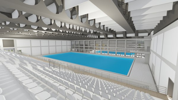 Κλειστή πισίνα ολυμπιακών διαστάσεων (25 x 50 μ.) με κερκίδες περίπου 1.250 θέσεων.