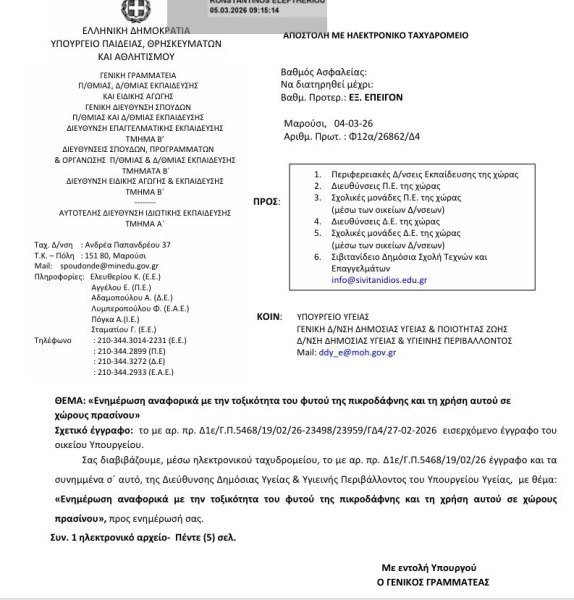 Η εγκύκλιος του υπουργείου συνοδεύεται από αναλυτική έκθεση του ΕΟΔΥ που αναφέρει όλες τις επιπτώσεις που μπορεί να έχει στην υγεία η επαφή με το φυτό, καθώς και τα απαραίτητα μέτρα πρόσληψη που μπορούν να λάβουν τα σχολεία.