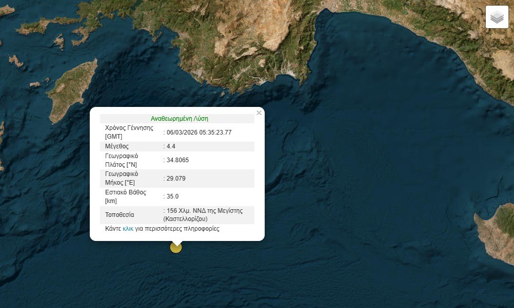 Σύμφωνα με το Γεωδυναμικό Ινστιτούτο του Εθνικού Αστεροσκοπείου Αθηνών, το επίκεντρο της δόνησης εντοπίζεται στον θαλάσσιο χώρο 156 χλμ. νότια-νοτιοδυτικά της Μεγίστης (Καστελλορίζου).