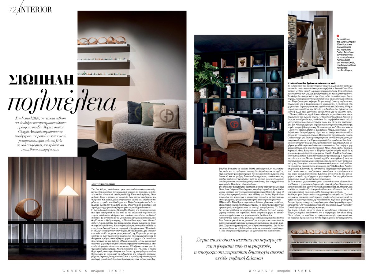 Ξεχωριστή θέση κατέχουν επίσης η μόδα και το design: από την παρουσία του οίκου Giorgio Armani στη διεθνή έκθεση Nomad 2026 στο Σεν Μόριτς έως το εντυπωσιακό fashion story «Belle de Jour», με τις νέες τάσεις της άνοιξης και του καλοκαιριού κάτω από τον λαμπερό ελληνικό ουρανό.