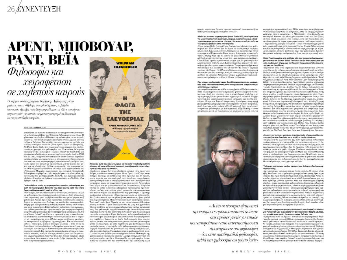 Παράλληλα, ο συγγραφέας Βόλφραμ Αϊλενμπεργκερ φωτίζει τις ιδέες τεσσάρων σπουδαίων φιλοσόφων – της Χάνα Άρεντ, της Σιμόν ντε Μποβουάρ, της Άυν Ραντ και της Σιμόν Βέιλ – ενώ τρεις Ιρανές μιλούν για τη ζωή και τον αγώνα των γυναικών στο Ιράν.