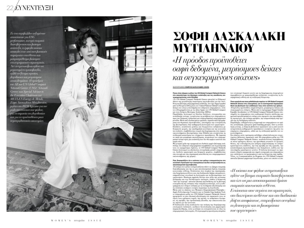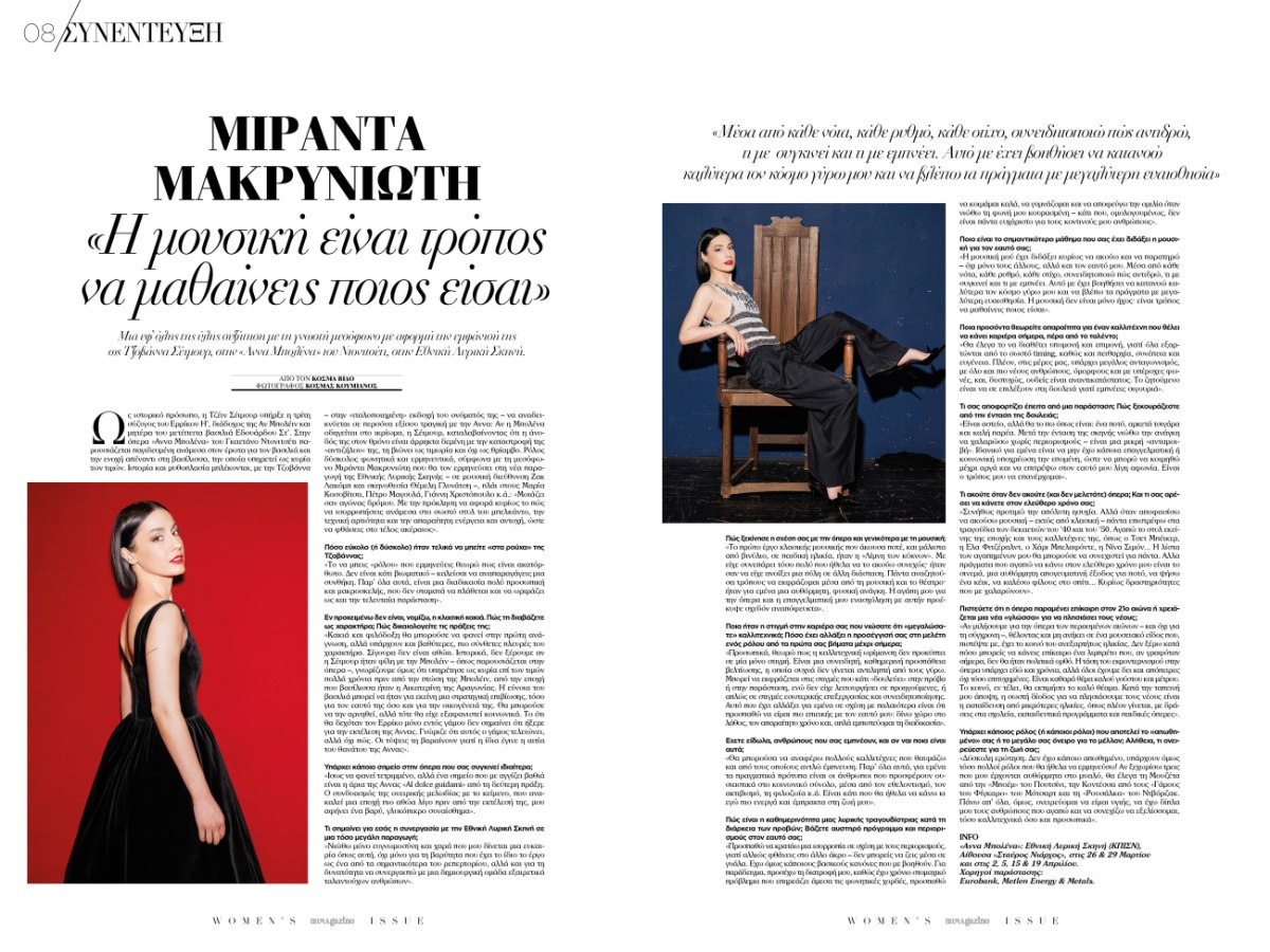 Στις σελίδες του τεύχους ξεχωρίζουν σημαντικές συνεντεύξεις και ιστορίες: η δημιουργός κοσμημάτων Ιλεάνα Μακρή μιλά για τη δημιουργία και την προσωπική έκφραση, η μεσόφωνος Μιράντα Μακρυνιώτη με αφορμή την εμφάνισή της στην όπερα Anna Bolena του Γκαετάνο Ντονιτσέτι στην Εθνική Λυρική Σκηνή, ενώ η Σόφη Δασκαλάκη Μυτιληναίου, πρόεδρος του ΔΣ του UN Global Compact Network Greece και Special Advisor to the Executive Chairman της METLEN Energy & Metals, μιλά για τη σημασία της έμφυλης ισότητας και της υπεύθυνης επιχειρηματικής ηγεσίας.
