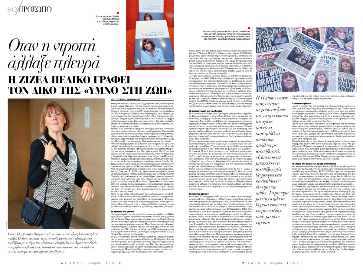 Στο τεύχος φιλοξενούνται ακόμη η συγγραφέας Ζιζέλ Πελικό με το νέο της βιβλίο Ύμνος στη Ζωή και η ταλαντούχα σεφ Μάγκυ Ταμπακάκη που μιλά για τη διαδρομή της στη γαστρονομία.