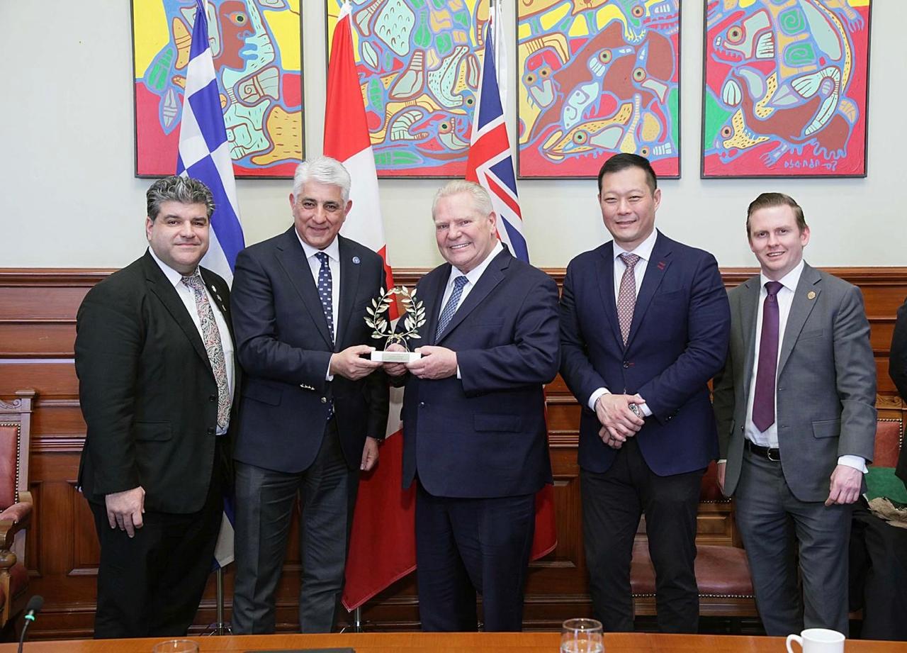 Εν συνεχεία, τα μέλη της Ελληνικής Αποστολής επισκέφθηκαν το Κοινοβούλιο του Οντάριο, όπου συναντήθηκαν και αντάλλαξαν αναμνηστικά δώρα με τον Πρωθυπουργό του Οντάριο κ. Doug Ford, τον Υπουργό Τουρισμού, Πολιτισμού και Παιγνίων κ. Stan Cho, τον Υπουργό Ιθαγένειας και Πολυπολιτισμικότητας κ. Graham McGregor, καθώς και τον Υπουργό Οικονομικής Ανάπτυξης κ. Victor Fedeli, ο οποίος συμμετείχε μέσω τηλεδιάσκεψης.