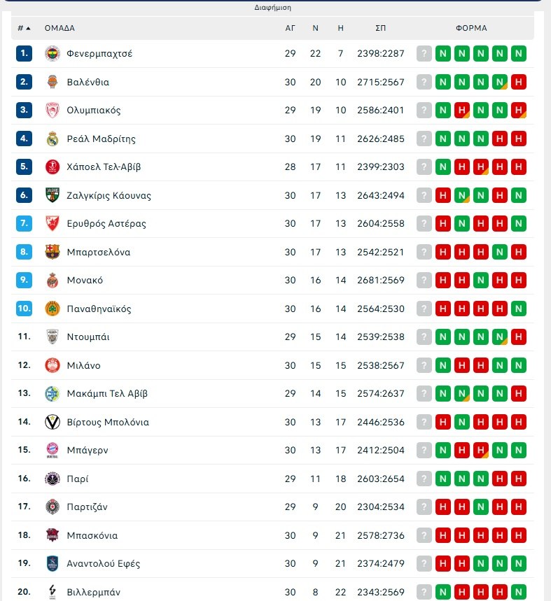 Βαθμολογία Euroleague: Με το ντέρμπι «αιωνίων» στο Στάδιο Ειρήνης και Φιλίας ανάμεσα σε Ολυμπιακό και Παναθηναϊκό, ολοκληρώθηκε η 30η αγωνιστική της Euroleague.