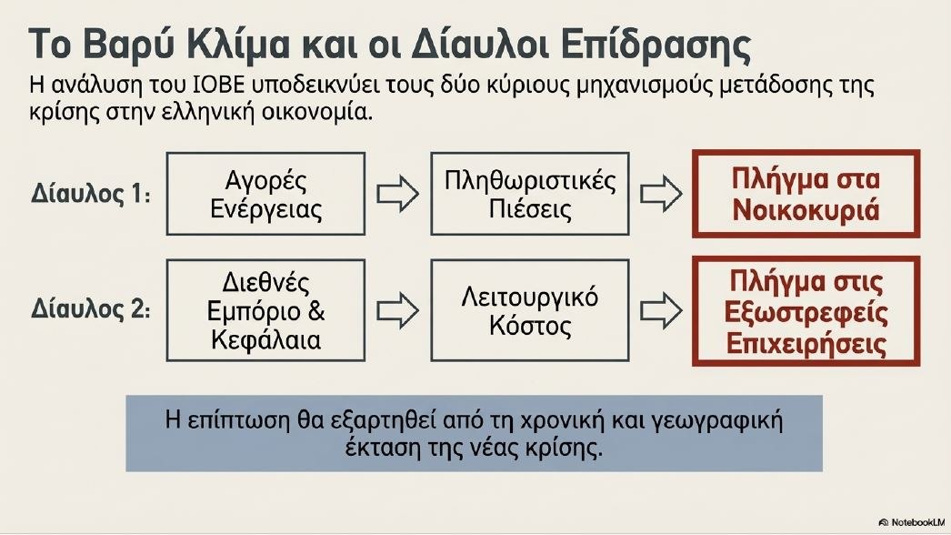 «Η επίπτωση στο εγχώριο οικονομικό κλίμα κατά το επόμενο διάστημα θα εξαρτηθεί από τη χρονική και γεωγραφική έκταση της νέας παγκόσμιας κρίσης και ειδικότερα από το αν θα διαφανεί σύντομα σύγκλιση προς μια λύση. Οι δίαυλοι δυνητικής επίδρασης στην ελληνική οικονομία είναι πολλοί, από έντονες αναταράξεις στις αγορές ενέργειας και πρόκληση πληθωριστικών πιέσεων που θα μπορούσαν να πιέσουν περαιτέρω τα νοικοκυριά, έως διαταραχή του διεθνούς εμπορίου και των αγορών κεφαλαίου που θα μπορούσε να επηρεάσει τις επιχειρήσεις και περισσότερο τις εξωστρεφείς», αναφέρει.