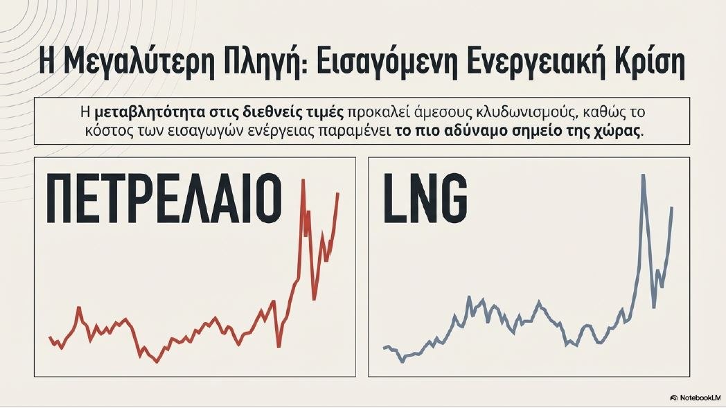 Η μεγαλύτερη πληγή για τη χώρα μας παραμένει το κόστος των εισαγωγών ενέργειας. Η μεταβλητότητα στις διεθνείς τιμές του πετρελαίου και του LNG προκαλεί κλυδωνισμούς.