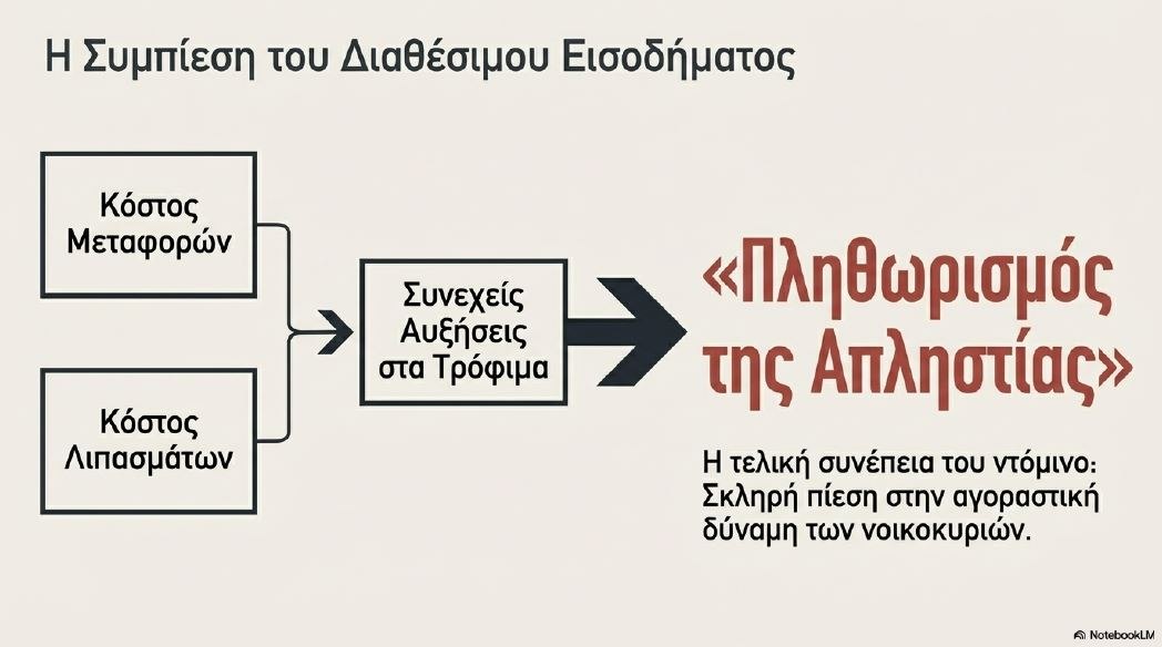 Ο «πληθωρισμός της απληστίας» και οι αυξήσεις στα τρόφιμα, που τροφοδοτούνται από το κόστος μεταφορών και λιπασμάτων, πιέζουν το διαθέσιμο εισόδημα των νοικοκυριών.