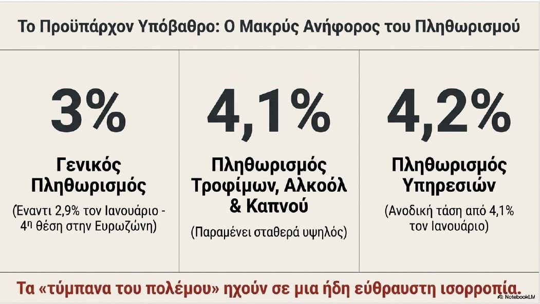 Με τα «τύμπανα του πολέμου» να ηχούν δυνατά η εύθραυστη ισορροπία συνθέτει ένα σκηνικό αυξημένης αβεβαιότητας. Πριν την έναρξη του πολέμου ο πληθωρισμός στην Ελλάδα ανήλθε στο 3% έναντι 2,9% τον Ιανουάριο, σύμφωνα με τα προκαταρκτικά στοιχεία της Eurostat, καταλαμβάνοντας την τέταρτη θέση μεταξύ των κρατών-μελών της ευρωζώνης.
