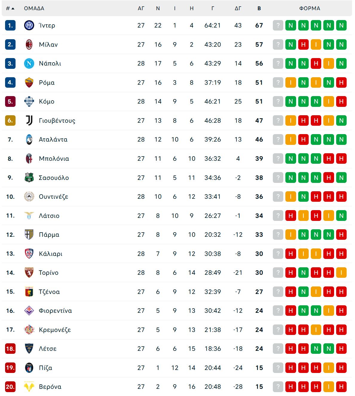 Τα αποτελέσματα και το υπόλοιπο πρόγραμμα της 28ης αγωνιστικής της Serie A: