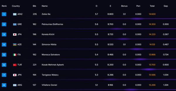 Ο 24χρονος Ιάπωνας Κιίτσι Κανέτα πήρε την τρίτη θέση και το χάλκινο μετάλλιο με βαθμολογία 14.233β (5.5, 8.733β), νικώντας στις λεπτομέρειες τον Αζέρο Νικίτα Σιμόνοφ, που είχε τον ίδιο βαθμό δυσκολίας αλλά με ελαφρώς χειρότερη εκτέλεση έμεινε στους 14.133β (5.5, 8.533β).