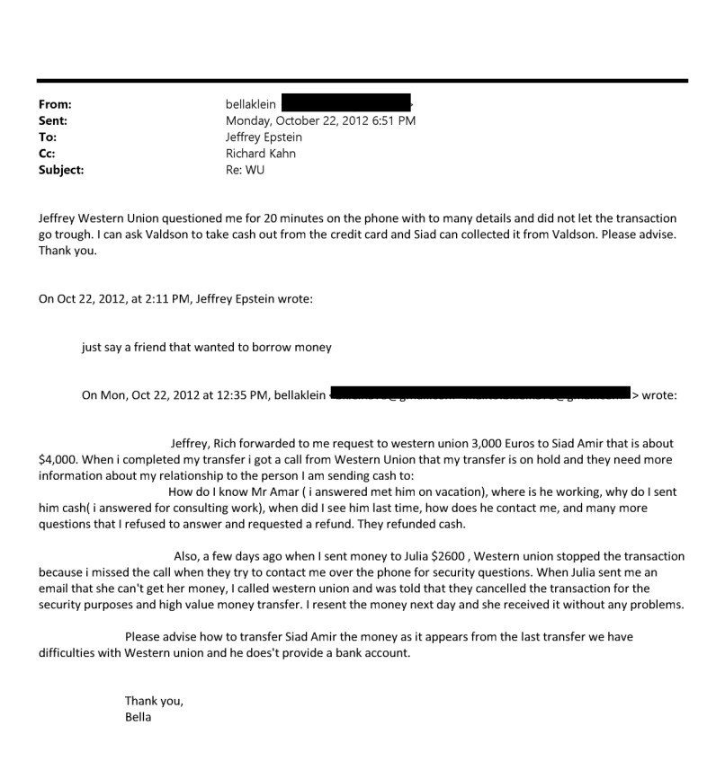 Σε ένα email του 2012, όταν η Western Union μπλόκαρε μεταφορά χρημάτων, ο Έπσταϊν φέρεται να απάντησε: «Απλώς πες ότι ένας φίλος ήθελε να δανειστεί χρήματα».