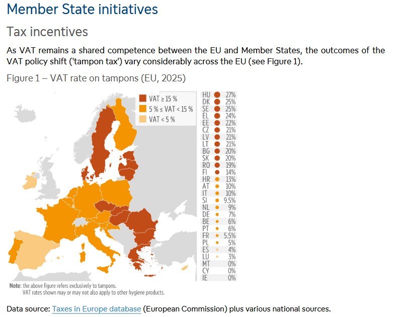 Καθώς ο ΦΠΑ αποτελεί κοινή αρμοδιότητα της Ευρωπαϊκής Ένωσης και των κρατών-μελών, τα αποτελέσματα της αλλαγής στην πολιτική ΦΠΑ για τα προϊόντα περιόδου (ο λεγόμενος «tampon tax») διαφέρουν σημαντικά μεταξύ των χωρών της ΕΕ.