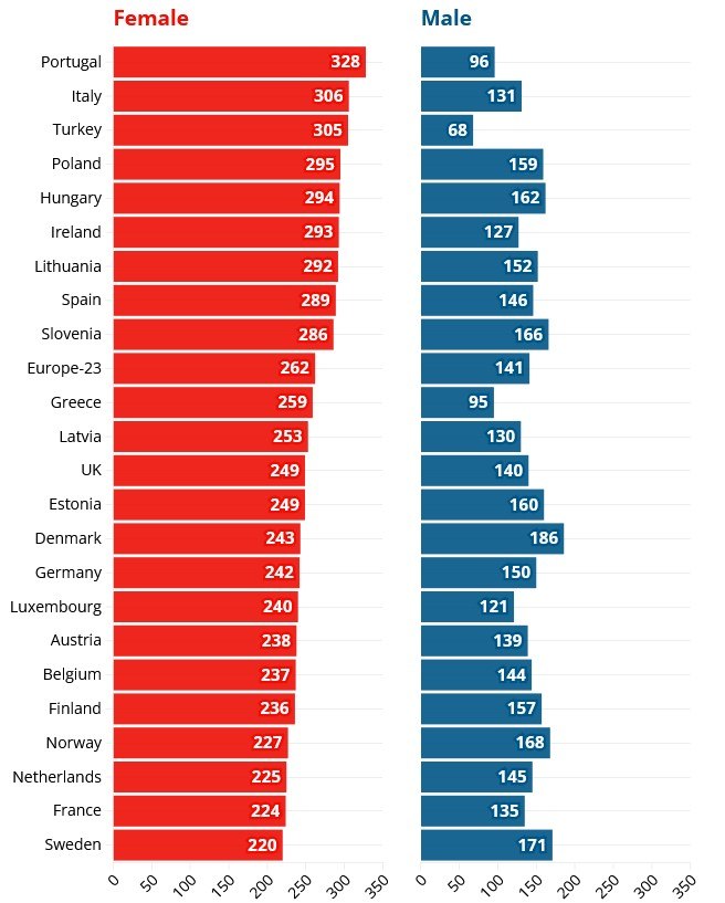 Μετά την ακραία περίπτωση της Τουρκίας, όπου οι γυναίκες κάνουν 3,5 φορές (349%) περισσότερη απλήρωτη εργασία από τους άνδρες, τα μεγαλύτερα χάσματα εμφανίζονται στη Νότια Ευρώπη: στην Πορτογαλία (242%), στην Ελλάδα (173%) και στην Ιταλία (134%). Η Ισπανία κατατάσσεται επίσης ψηλά, στην έβδομη θέση, με χάσμα 98%, που σημαίνει ότι οι γυναίκες κάνουν σχεδόν διπλάσια απλήρωτη εργασία από τους άνδρες.