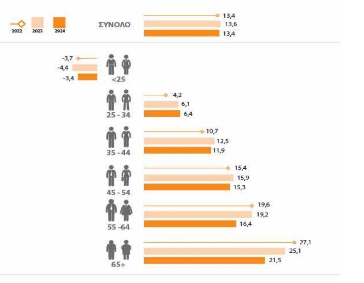 Σε επίπεδο συνόλου της οικονομίας, τα στοιχεία δείχνουν μια σχεδόν παγωμένη εικόνα. Το μισθολογικό χάσμα διαμορφώθηκε στο 13,4% το 2022, αυξήθηκε ελαφρώς στο 13,6% το 2023 και επανήλθε στο 13,4% το 2024.