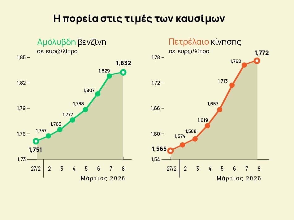 Οι αυξήσεις στην τιμή της βενζίνης και του πετρελαίου κίνησης δεν σταματούν. Ήδη, από την πρώτη εβδομάδα του πολέμου στη Μέση Ανατολή, η μέση τιμή στην αμόλυβδη βενζίνη έχει ανατιμηθεί κατά 0,081 ευρώ ανά λίτρο και του ντίζελ κατά 0,207 ευρώ ανά λίτρο.