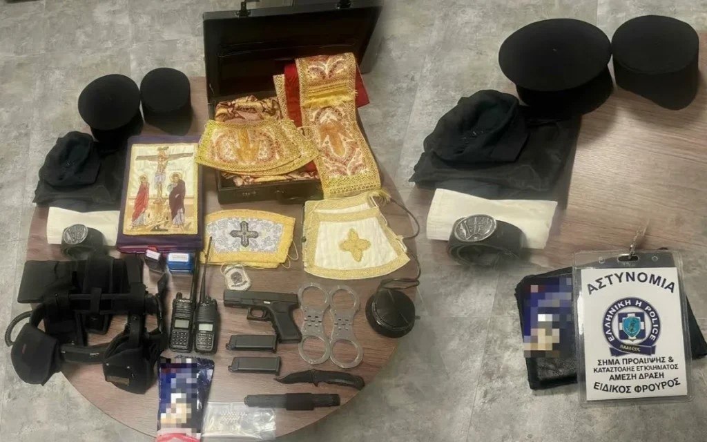 Επιπλέον, βρέθηκαν δύο φορητοί ασύρματοι, μεταλλική πτυσσόμενη αστυνομική ράβδος, φορητή συσκευή φωτεινών σημάτων (φάρος), δύο σφραγίδες με στοιχεία αστυνομικού και ιερομονάχου αντίστοιχα, καθώς και είδη μοναχικής περιβολής, όπως καλπάκι, κουκούλια και καλιμάφκι, μαζί με ένα Ιερό Ευαγγέλιο.