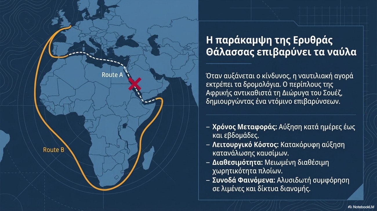 Το πρόσφατο προηγούμενο της κρίσης ασφαλείας στην Ερυθρά Θάλασσα (τέλη 2023–2024) δείχνει πώς αντιδρά η ναυτιλιακή αγορά όταν αυξάνεται ο κίνδυνος: ακόμη και χωρίς πλήρη