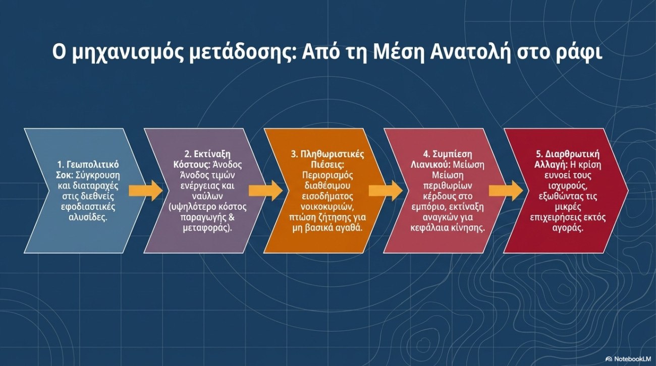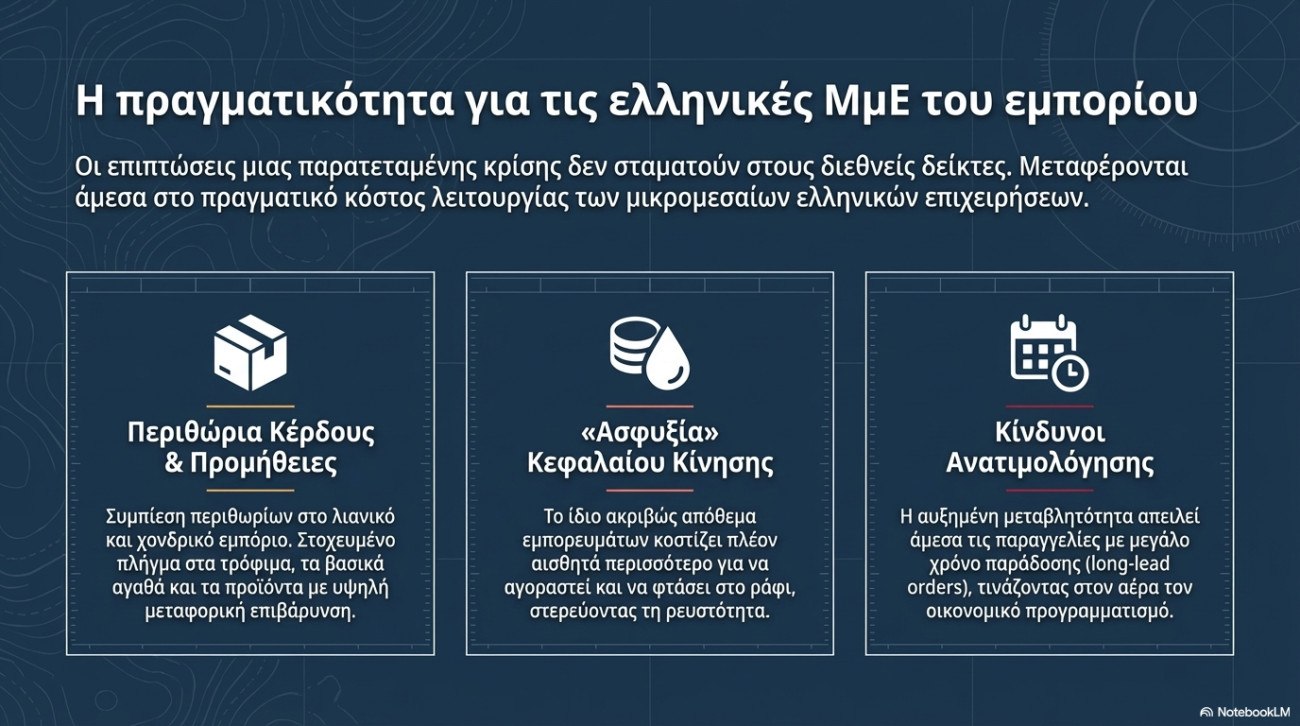 Για την ελληνική οικονομία, και ιδιαίτερα για τις μικρομεσαίες επιχειρήσεις του εμπορίου, οι επιπτώσεις μιας παρατεταμένης γεωπολιτικής έντασης δεν περιορίζονται στις διεθνείς τιμές ενέργειας, αλλά μεταφέρονται άμεσα στο πραγματικό κόστος προμηθειών.