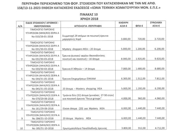 «Για τα ανωτέρω Τιμολόγια Παροχής Υπηρεσιών και τις εργασίες-παροχές εργασιών όπως αναγράφονται στα ΤΠΥ δεν προσκομίσθηκαν ιδιωτικά συμφωνητικά των αντισυμβαλλόμενων μερών και οι υπεργολαβίες που ανατέθηκαν στον εκδότη των τιμολογίων (Ιονία Τεχνική) από την λήπτρια επιχείρηση (Μάρκετινγκ Έρευνα Επικοινωνία Α.Ε.) απαιτούσαν για την υλοποίηση-πραγματοποίησή τους εκτός των άλλων την οργάνωση πολυμελών συνεργείων, την απαιτούμενη εκπαίδευση για την υλοποίηση των υπηρεσιών, την καταβολή ασφαλιστικών εισφορών. Η ελεγχόμενη (Ιονία Τεχνική) δεν διέθετε το προσωπικό για την πραγματοποίηση των υπηρεσιών».