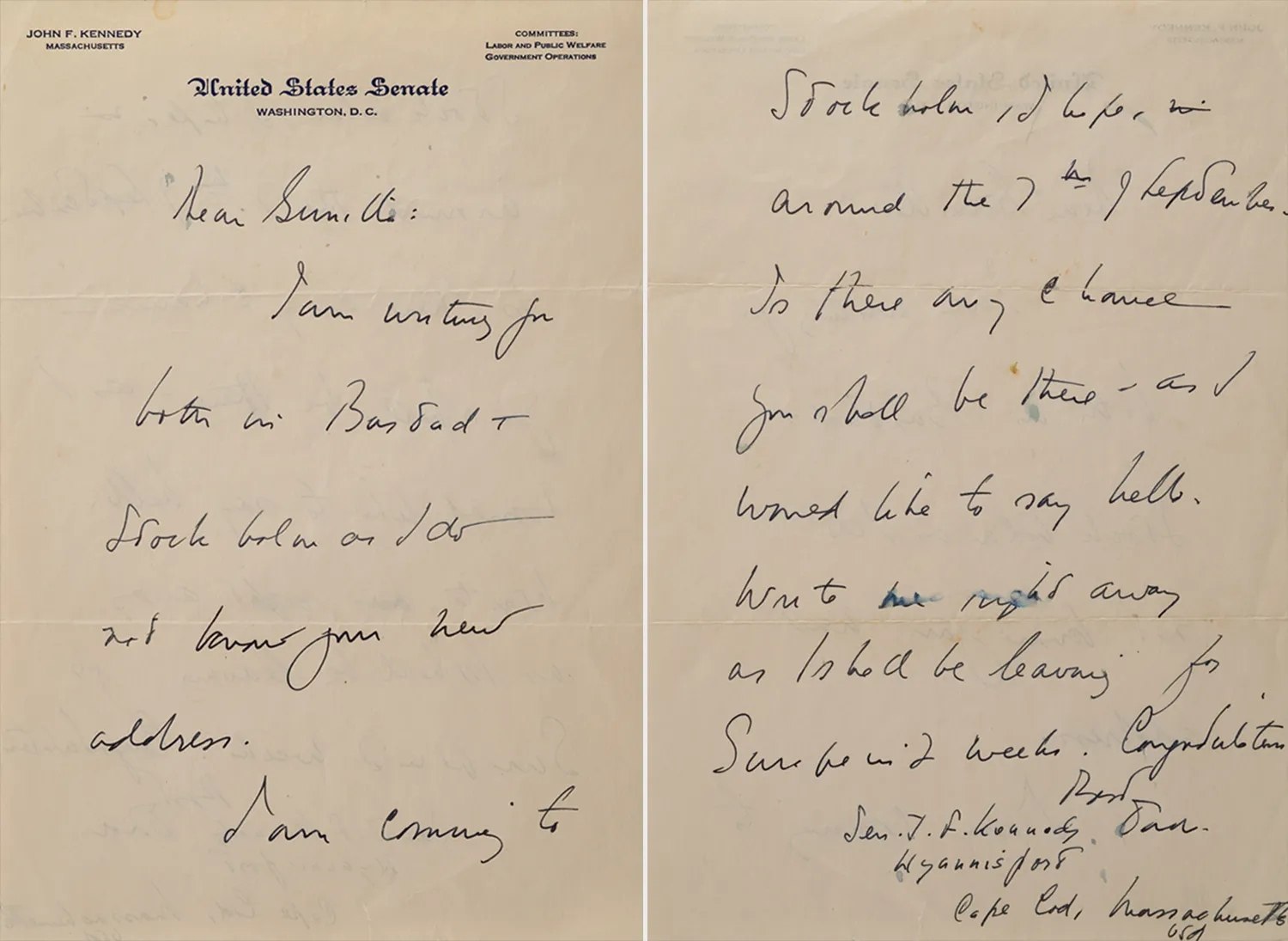 Η χειρόγραφη ερωτική επιστολή του τότε γερουσιαστή Τζον Φ. Κένεντι προς τη σουηδή αριστοκράτισσα Γκουνίλα Φον Ποστ βγαίνει σε δημοπρασία, με το επιστολόχαρτο του Αμερικανικού Κογκρέσου και όλα τα σχετικά στοιχεία.