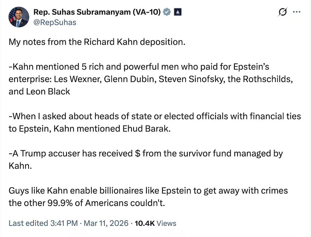 Σύμφωνα με το Politico, ο Σουμπραμανιάμ δήλωσε ότι ο Καν ανέφερε στην επιτροπή ότι ένας μη Αμερικανός αρχηγός κράτους είχε πραγματοποιήσει οικονομικές συναλλαγές με τον Έπσταϊν.