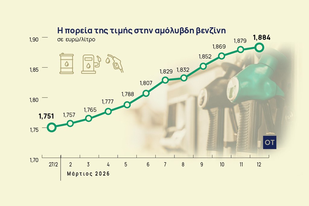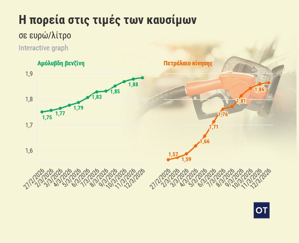 Ειδικότερα, η αμόλυβδη βενζίνη έχει αυξηθεί, σύμφωνα και με τα τελευταία στοιχεία του Παρατηρητηρίου Τιμών στα υγρά καύσιμα, κατά 0,133 ευρώ ανά λίτρο (13 λεπτά του ευρώ ανά λίτρο), ενώ σοκάρει… η ανατίμηση στο πετρέλαιο κίνησης: Μέσα σε δύο εβδομάδες πολέμου έχει ακριβύνει κατά 0,30 ευρώ ανά λίτρο (30 λεπτά του ευρώ ανά λίτρο).