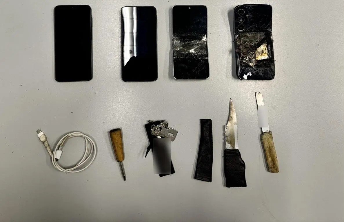 Στο πλαίσιο των ερευνών, κατά περίπτωση, βρέθηκαν και κατασχέθηκαν, -2- μαχαίρια, αυτοσχέδιο σουβλί, -4- κινητά τηλέφωνα, φορτιστής κινητών τηλεφώνων, κρίκος με -3- κλειδιά, καθώς και ιδιόχειρες σημειώσεις.