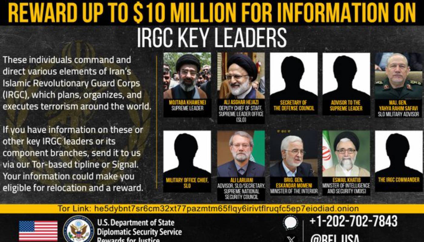Με ανακοίνωσή του, το πρόγραμμα Rewards for Justice του Στέιτ Ντιπάρτμεντ ζήτησε πληροφορίες για «ιρανικά τρομοκρατικά ηγετικά στελέχη», συμπεριλαμβανομένου του νέου αγιατολάχ Μοτζτάμπα Χαμενεΐ. Η αμοιβή για τον Χαμενεΐ είναι, σύμφωνα με την ανακοίνωση, έως 10 εκατ. δολάρια και ότι οι πληροφορίες θα μπορούσαν να κάνουν κάποιον επιλέξιμο για «μεταφορά ασφαλείας».