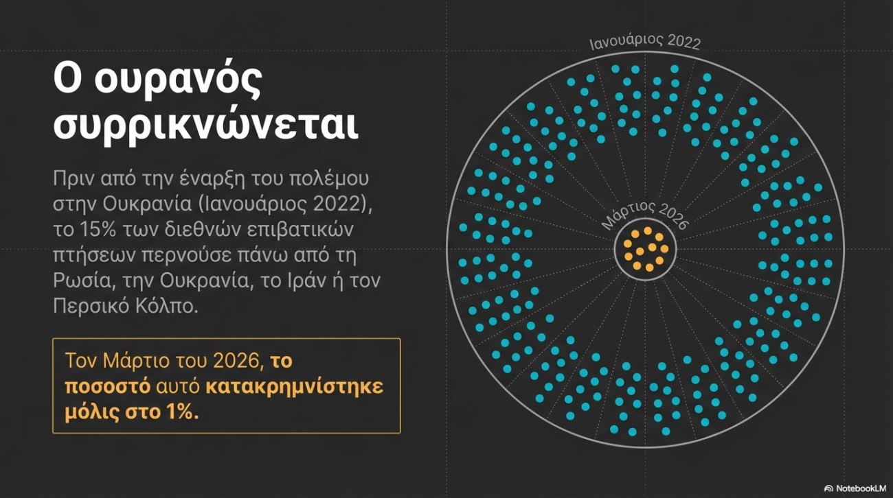 Τα νούμερα είναι ενδεικτικά: τον Ιανουάριο του 2022, περίπου το 15% των διεθνών επιβατικών πτήσεων περνούσε πάνω από τη Ρωσία, την Ουκρανία, το Ιράν ή τον Περσικό Κόλπο. Φέτος τον Μάρτιο, το ποσοστό αυτό έπεσε μόλις στο 1%.