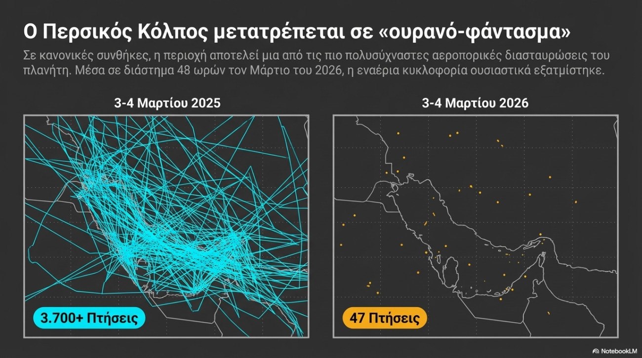 Για να γίνει αντιληπτή η διαφορά: τον Μάρτιο του 2025, μέσα σε ένα τυπικό 48ωρο, περισσότερα από 3.700 επιβατικά αεροσκάφη διέσχιζαν τον Περσικό Κόλπο. Τα περισσότερα από αυτά είχαν ως αφετηρία ή προορισμό το Ντουμπάι (Ηνωμένα Αραβικά Εμιράτα) ή την Ντόχα (Κατάρ). Φέτος, στις 3 και 4 Μαρτίου, μόλις 47 πτήσεις διέσχισαν το ίδιο κομμάτι του ουρανού.