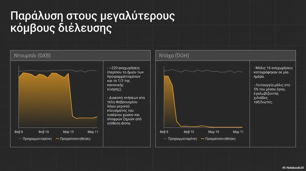 Σύμφωνα με πρόσφατα στοιχεία (11 Μαρτίου), καταγράφηκαν περίπου 220 αναχωρήσεις από το Ντουμπάι – μόλις το ένα τρίτο της κανονικής του κίνησης και οι μισές από όσες ήταν προγραμματισμένες. Την ίδια μέρα, από την Ντόχα αναχώρησαν μόλις 16 πτήσεις, νούμερο που αντιστοιχεί στο 5% του μέσου όρου της.