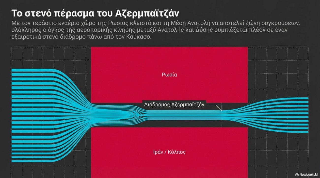 Μπορεί ο εναέριος χώρος του Κόλπου να είναι πολύ μικρότερος από τις αχανείς εκτάσεις της Ρωσίας, όμως πλέον η περισσότερη εναέρια κυκλοφορία μεταξύ Ανατολής και Δύσης συμπιέζεται σε έναν επικίνδυνα στενό διάδρομο πάνω από το Αζερμπαϊτζάν.