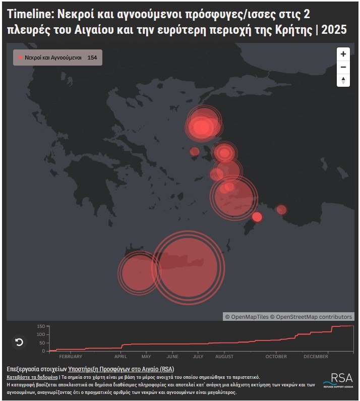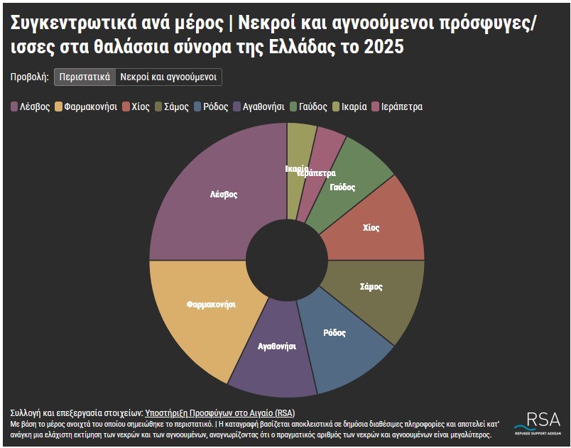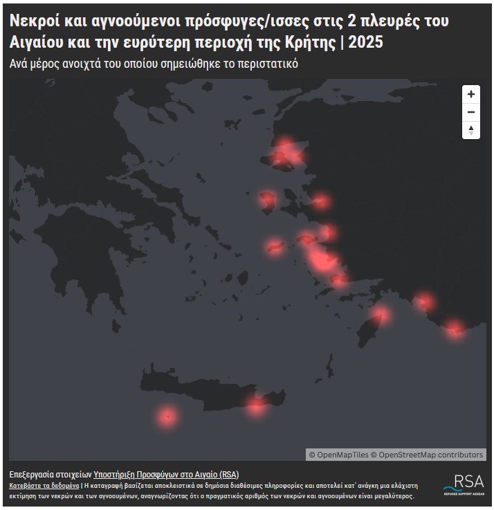 Από τα 28 θανατηφόρα περιστατικά με νεκρούς/ές ή αγνοούμενους/ες, 14 σημειώθηκαν στο Βόρειο Αιγαίο, 11 στο Νότιο Αιγαίο και 3 στην Κρήτη. Επιπλέον, το 2025 καταγράφηκαν τουλάχιστον 18 γυναίκες και 10 παιδιά νεκρά ή αγνοούμενα.