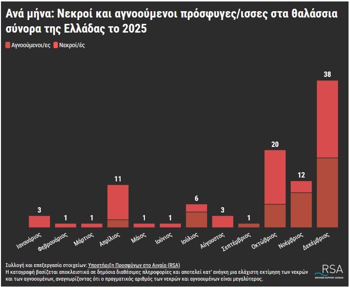 Τουλάχιστον 58 πρόσφυγες και προσφύγισσες ανασύρθηκαν νεκροί/ες και ακόμα 40 αγνοούνται (και θεωρούνται πλέον νεκροί) σε 28 θανατηφόρα περιστατικά (εκ των οποίων 16 ναυάγια) στα θαλάσσια σύνορα της Ελλάδας το 2025, σύμφωνα με την Refugee Support Aegean. Οι αριθμοί αυτοί προκύπτουν από τα στοιχεία που δημοσιεύουμε σήμερα για το σύνολο του έτους 2025, μετά από δική μας συλλογή και επεξεργασία, με βάση δημόσια διαθέσιμες πηγές.