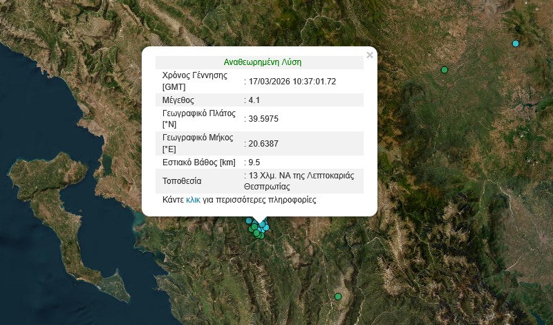 Υπενθυμίζεται ότι, σύμφωνα με το Γεωδυναμικό Ινστιτούτο του Εθνικού Αστεροσκοπείου Αθηνών το επίκεντρο του σεισμού, που σημειώθηκε στις 12:37, ήταν 13 χιλιόμετρα νοτιοανατολικά της Λεπτοκαρυάς Θεσπρωτίας, ενώ το εστιακό βάθος εντοπίστηκε στα 9,5 χιλιόμετρα.