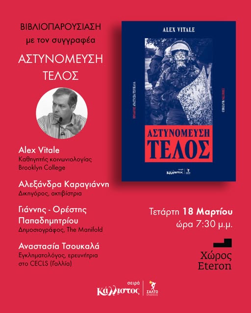 Το βιβλίο του Άλεξ Βιτάλε παρουσιάζεται στην Αθήνα, στον χώρο Eteron, την Τετάρτη 18 Μαρτίου, στις 7.30 μμ με τη συμμετοχή του συγγραφέα, του δημοσιογράφου του in Γιάννη Ορέστη Παπαδημητρίου, της δικηγόρου-ακτιβίστρικας Αλεξάνδρας Καραγιάννη και της ερευνήτριας Αναστασίας Τσουκαλά.