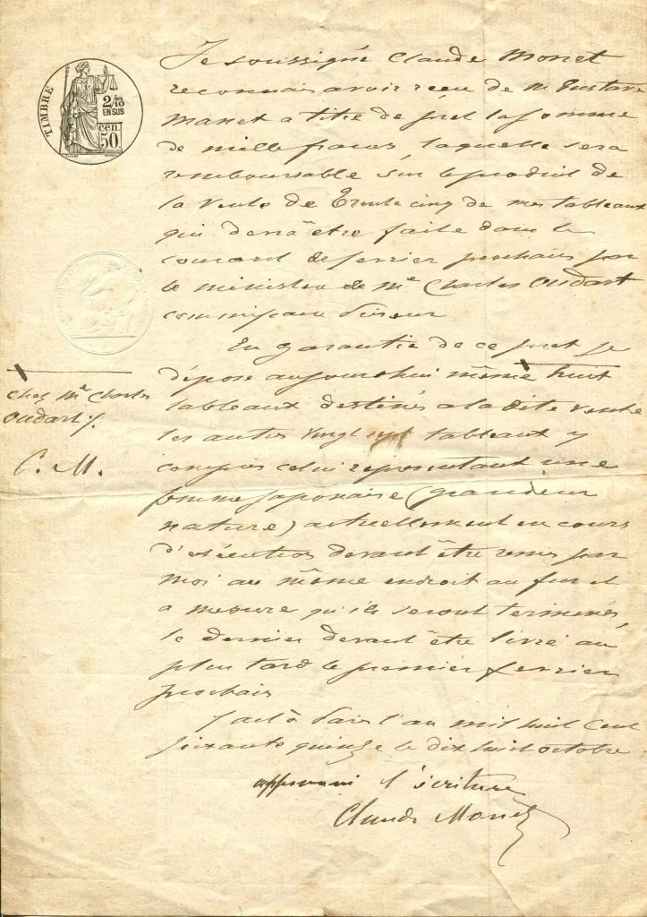 Η επιστολή, με ημερομηνία 18 Οκτωβρίου 1875, αναφέρει: «Εγώ, ο κάτωθι υπογράφων Κλοντ Μονέ, βεβαιώνω ότι έλαβα από τον κ. Γκυστάβ Μανέ, ως δάνειο, το ποσό των χίλιων φράγκων, το οποίο θα αποπληρωθεί από τα έσοδα της πώλησης 35 πινάκων μου, η οποία θα πραγματοποιηθεί τον ερχόμενο Φεβρουάριο υπό τη διεύθυνση του κ. Σαρλ Οντάρ, δημοπράτη».