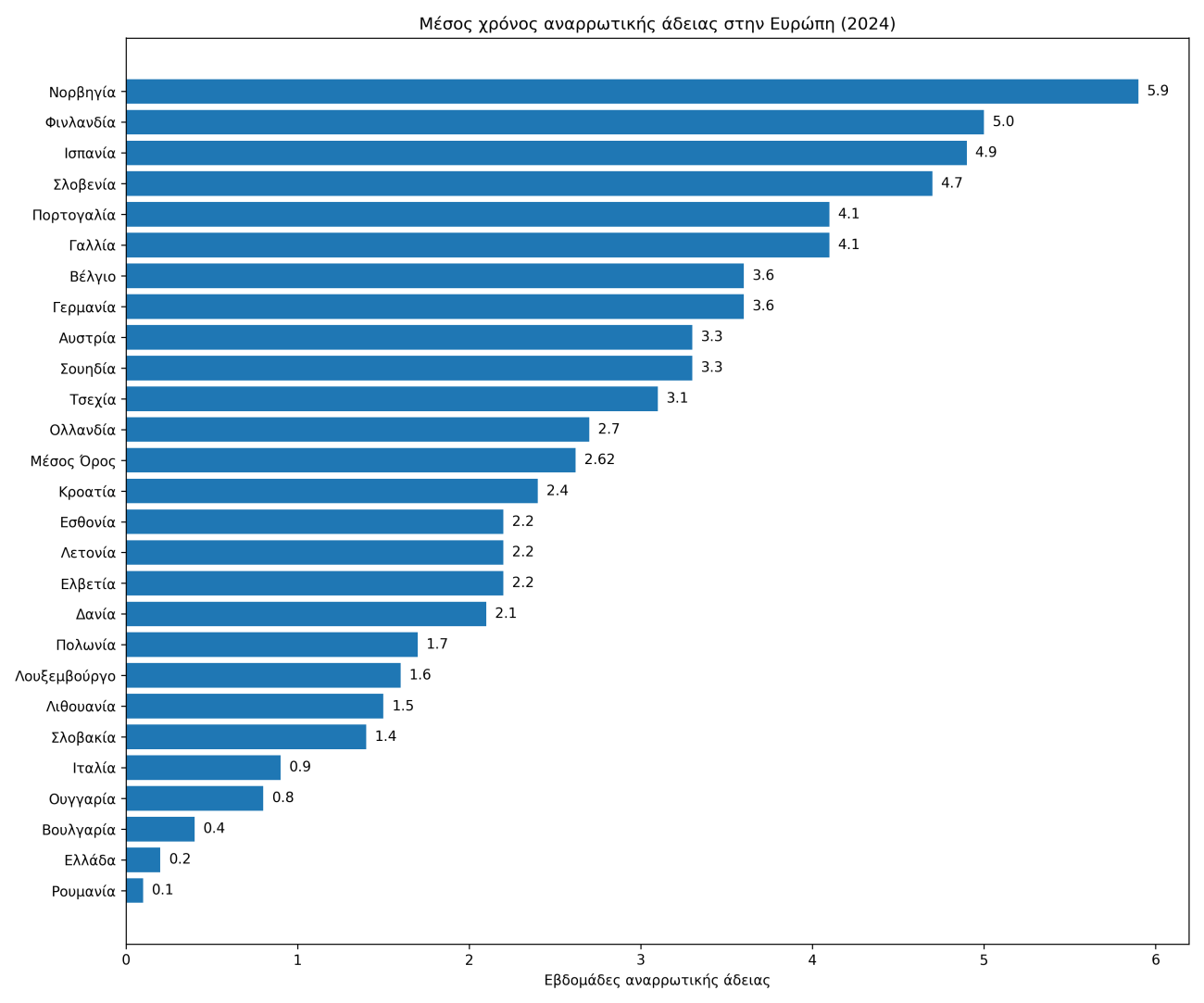 Ο ευρωπαϊκός μέσος όρος απουσίας λόγω ασθενείας σε 26 χώρες, είναι 2,62 εβδομάδες ετησίως. Απουσιάζουν τα στοιχεία για την Ισλανδία, τη Βρετανία και την Ιρλανδία, καθώς δεν είναι συγκρίσιμα (μετριούνται μόνο οι πλήρεις εβδομάδες άδειας).