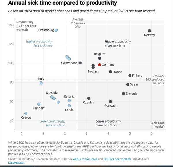 Αντίθετα, χώρες όπως η Ελλάδα και η Ουγγαρία έχουν ελάχιστες ημέρες αναρρωτικής άδειας ανά εργαζόμενο, αλλά βρίσκονται στο κατώτατο σημείο της κατάταξης παραγωγικότητας.