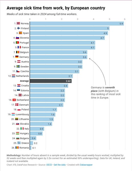 Οι Γερμανοί εργαζόμενοι πλήρους απασχόλησης απουσιάζουν λόγω ασθένειας 3,6 εβδομάδες ετησίως, όσο ακριβώς οι Βέλγοι. Βρίσκονται πάνω από τον Ευρωπαϊκό μέσο όρο, στην 7η θέση. Σε καμία περίπτωση όμως δεν είναι οι κατά συρροή «λουφαδόροι-κοπανατζήδες» όπως τους κατηγορεί ο καγκελάριος Μέρτς και όπως τους εμφανίζει σειρά δημοσιευμάτων.