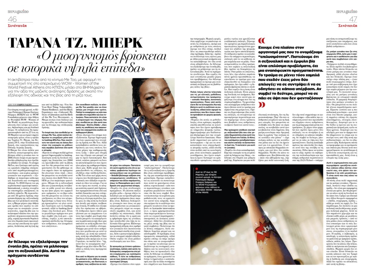 Ξεχωριστή θέση κατέχει η συνέντευξη της Ταράνα Τζ. Μπερκ, η οποία, με αφορμή τη συμμετοχή της στο WOW – Women of the World Festival Athens στο ΚΠΙΣΝ, μιλά για την ανάγκη συλλογικής δράσης απέναντι στη βία και την ανισότητα.