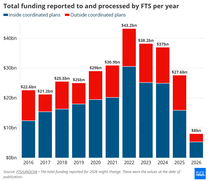 Η κατάσταση είναι παρόμοια σε όλο τον κόσμο: μεταξύ 2025 και 2026, η συνολική παγκόσμια χρηματοδότηση για ανθρωπιστική βοήθεια έπεσε κατακόρυφα από περίπου 23,97 δισ. ευρώ σε περίπου 7,34 δισ. ευρώ, σύμφωνα με τα τελευταία στοιχεία της Financial Tracking Service (FTS).