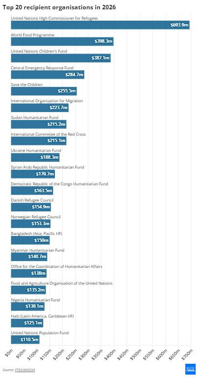 Μέχρι στιγμής, η Ύπατη Αρμοστεία των Ηνωμένων Εθνών για τους Πρόσφυγες, το Παγκόσμιο Επισιτιστικό Πρόγραμμα και το Κεντρικό Ταμείο Αντιμετώπισης Εκτάκτων Αναγκών είναι οι τρεις κορυφαίοι οργανισμοί που λαμβάνουν τα περισσότερα κονδύλια το 2026, αλλά τα ποσά αυτά έχουν μειωθεί σε σύγκριση με πέρυσι.