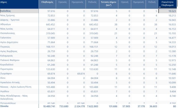 Στην κορυφή της λίστας βρίσκονται δήμοι όπως η Καλλιθέα (19.523 κάτοικοι/χλμ²), η Νέα Σμύρνη (18.213), ο Δήμος Αθηναίων (16.933), η Θεσσαλονίκη (15.193). Πρόκειται για περιοχές όπου η πυκνότητα πληθυσμού θυμίζει μεγάλες μητροπόλεις του εξωτερικού. Αυτή η συγκέντρωση όμως δεν είναι απλώς στατιστικό μέγεθος — είναι καθημερινότητα που πιέζει ασφυκτικά τις υποδομές και τις αντοχές των πόλεων.