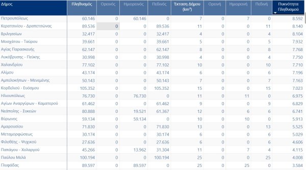 Οι αριθμοί δεν λένε ποτέ όλη την αλήθεια. Στην περίπτωση όμως των ελληνικών δήμων, αποκαλύπτουν μια έντονη αντίθεση: από τη μία, αστικά κέντρα όπου χιλιάδες άνθρωποι «στριμώχνονται» σε κάθε τετραγωνικό χιλιόμετρο και από την άλλη, τεράστιες εκτάσεις με ελάχιστους κατοίκους. Και στις δύο περιπτώσεις, οι τοπικές κοινωνίες δοκιμάζονται — απλώς με διαφορετικό τρόπο.