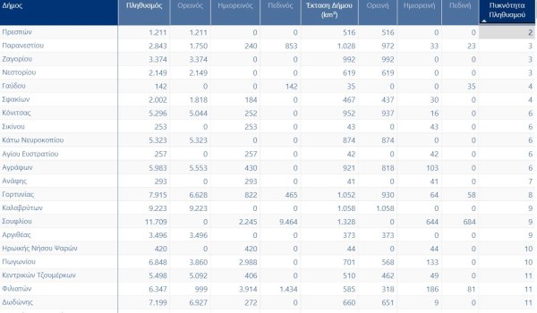 Στον αντίποδα βρίσκονται δήμοι όπως οι Πρέσπες (2 κάτοικοι/χλμ²), το Παρανέστι (3), το Ζαγόρι (3), το Νεστόριο (3) και τα Σφακιά (4), όπου η πρόκληση δεν είναι η υπερσυγκέντρωση αλλά η απουσία πληθυσμού.