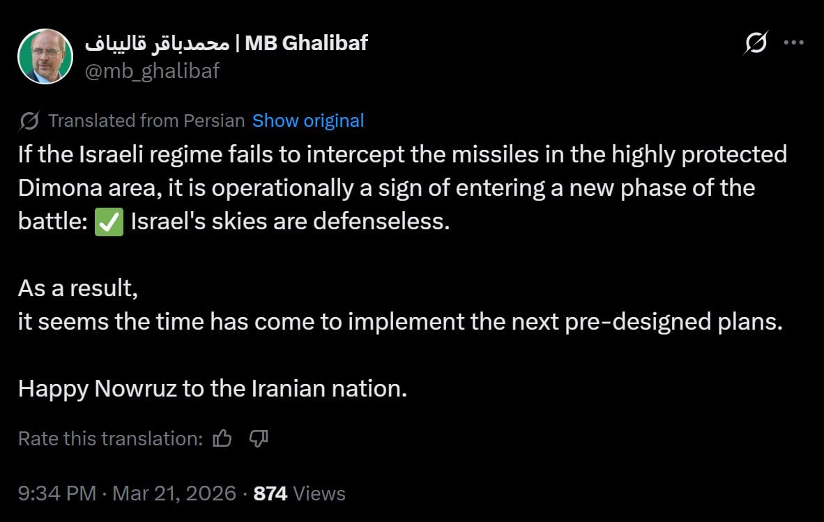 Ο πρόεδρος του ιρανικού Κοινοβουλίου Μοχάμαντ Μπαγκέρ Γκαλιμπάφ δήλωσε ότι «Εάν το ισραηλινό καθεστώς δεν καταφέρνει να αναχαιτίσει τους πυραύλους στην άκρως προστατευόμενη περιοχή της Ντιμόνα, αυτό αποτελεί, από επιχειρησιακή άποψη, ένδειξη ότι εισερχόμαστε σε μια νέα φάση της μάχης: Ο ουρανός του Ισραήλ είναι ανυπεράσπιστος.